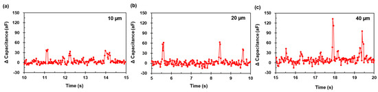 From the above results, the capacitance change tends to be proportional to the particles. This is because the volume occupied by the particle is directly related to the capacitance change. Of course, the range of the measured signal amplitude based on the particle size is wide. This is because of the influence of particle z-axis position from the IDEs, which have commonly been pointed out at the planar electrode. Additionally, the existence of particles smaller than provided added uncertainty in that one cannot know the exact particle size. Therefore, the relationship between the particle size and the capacitance change could be possible to estimate roughly, but accuracy is still limited.