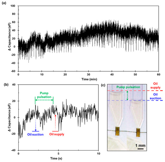 Figure 13a presents the measured capacitance signals during the operation of the pump system for an hour. The periodic pattern in which the drifting signal descended and recovered was identified as , as illustrated in Figure 13b. In addition, the surface level of the oil fluctuated, as illustrated in Figure 13c. This can be explained as a pump pulsation that occurred owing to the operation principle of the peristaltic pump. Squeeze (oil suction from the oil reservoir) for self-priming and rotation (oil supply to the oil inlet port) to force the oil onward by three rollers in the pump caused the internal pressure to increase and dissolve. Therefore, as the sensing volume was directly related to the signal, it expanded and contracted repeatedly owing to the PDMS elasticity.