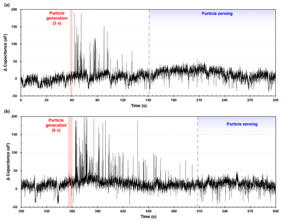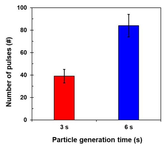 Figure 17 presents the number of capacitive pulses in different particle generation times. The pulses were counted based on the validated signal patterns of the individual particles. The amplitude criterion for distinguishing the noise level and pulse is 30 aF. Given the results of the validation test for the MPs in this study, this amplitude could be applied to understand the particle generation that suddenly occurred larger than a certain size. Reflecting the errors owing to particle behavior, the pulses were 39 and 84 for different particle generation times: 3 s and 6 s, respectively. The longer the particle generation time, the greater the number of pulse signals identified.