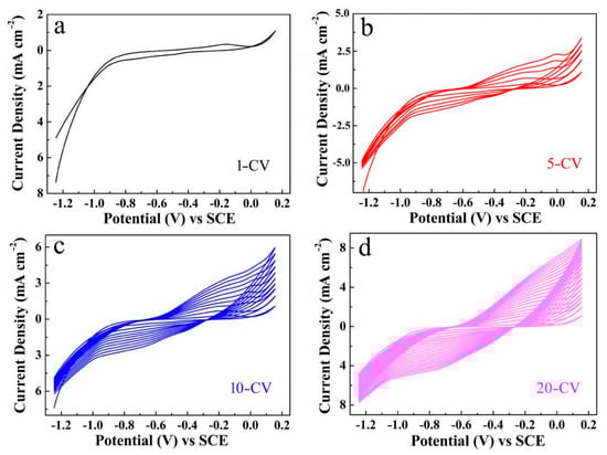 The second step for Ni2S3 electrodeposition was carried out with the same three-electrode system, except the working electrode is Ni foam deposited by ZnO obtained in the previous step and the electrolyte is a mixture solution containing 0.05 M NiCl2 and 1 M CH4N2S. The CV electrodeposition was performed by 10 cycles (abbreviated as 10-CV) in the range of −1.25 to 0.16 V at a scan rate of 0.005 V s−1. The CV electrodeposition curves obtained from different cycles are labeled as 1-CV, 5-CV, 10-CV and 20-CV (Figure 1). The corresponding products are to be tested after rinsing thoroughly.