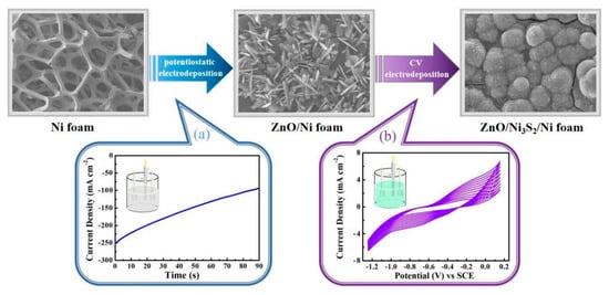 The ZnO/Ni2S3 composite is synthesized on Ni foam substrate by a two-step electrodeposition, and the construction process is illustrated in Figure 2. Firstly, potentiostatic electrodeposition is adopted to deposit ZnO nanosheets on the surface of Ni foam substrate. After that, CV electrodeposition is employed, by using a similar three-electrode system to achieve a Ni2S3 layer on the surface of ZnO, and the thickness of the Ni2S3 layer increases gradually with the increase in the number of cycles.