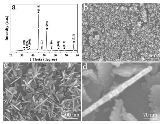 The XRD pattern of the product that is electrodeposited on the Ni foam substrate by the potentiostatic deposition method is shown in Figure 3a. Ni foam shows three strong diffraction peaks, which are marked with an asterisk (JCPDS card No. 03-1051). All other diffractions, marked with dot, are in good agreement of (100), (002), (101), (102), (110), (103), and (112) planes of the hexagonal phase of ZnO (JCPDS No.03-0888). The morphology and structure of ZnO are presented in Figure 3b–d. The FE-SEM image, in Figure 3b, displays that the dense ZnO nanostructures are uniformly distributed on the Ni foam substrate. The corresponding enlarged image in Figure 3c confirms that the ZnO nanosheets cross with each other, and the edges of these nanosheets are serrated. Closer observation reveals that the nanosheets are ca. 22 nm thick, and the serrated edges confirm that these nanosheets are composed of ZnO particles, with a size of about 15 nm (Figure 3d).