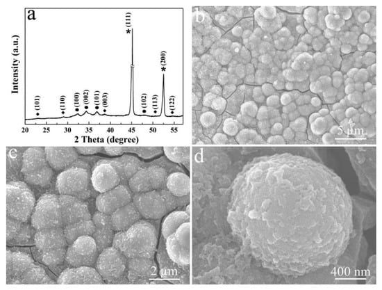 The ZnO/Ni2S3 composite was further obtained through the subsequent CV electrodeposition, as shown in Figure 4a. The XRD pattern of the product exhibits three kinds of diffraction peaks. In addition to the peaks that are marked with asterisks and dots belong to the Ni foam substrate and ZnO, respectively, the peaks that are marked with diamonds belong to the Ni2S3 obtained by CV electrodeposition (JCPDS card No. 44-1418). Figure 4b–d are the corresponding FE-SEM images, as seen from Figure 4b, ZnO nanosheets are completely covered and wrapped into ZnO/Ni2S3 composite nanospheres. The enlarged image in Figure 4c confirms that these ZnO/Ni2S3 composite nanospheres have rough surfaces, with approximately 1.4–1.8 µm in diameter. In fact, the rough surface is made up of tiny Ni2S3 particles that have been electrodeposited layer by layer (Figure 4d).