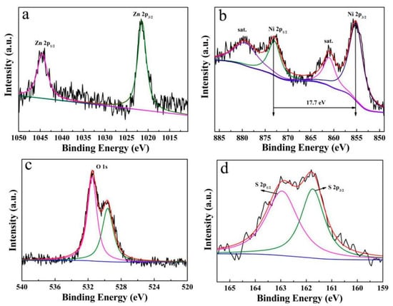 Figure 5 depicts the survey XPS spectra of the ZnO/Ni2S3 composite. From the Zn 2p spectrum (Figure 5a), two peaks located at 1044.70 and 1021.40 eV belong to Zn 2p1/2 and Zn 2p3/2, respectively, confirming the existence of ZnO [10,18]. As for the Ni 2p spectrum in Figure 5b, two major peaks of the binding energies at 855.60 and 873.30 eV, with a spin-energy separation of 17.7 eV, correspond to Ni 2p3/2 and Ni 2p1/2, respectively, indicating the emergence of Ni2+ and Ni3+ [19,20,21]. Apart from that, both of them have a satellite peak at 861.20 and 879.80 eV [22]. In regard to the O 1s spectrum in Figure 5c, as previously reported, the binding energy of 531.20 eV is ascribed to the oxygen bond with Zn2+, and the binding energy of 529.90 eV is assigned to the oxygen of NiO, which was generated from the reduction in part of the Ni3+ during electrodeposition [10,18]. The S 2p spectrum in Figure 5d can be divided into two peaks that are centered at 162.99 and 161.54 eV, corresponding to S 2p1/2 and S 2p3/2 of S2−, respectively, which are in agreement with those of Ni2S3 in the reports [23,24].