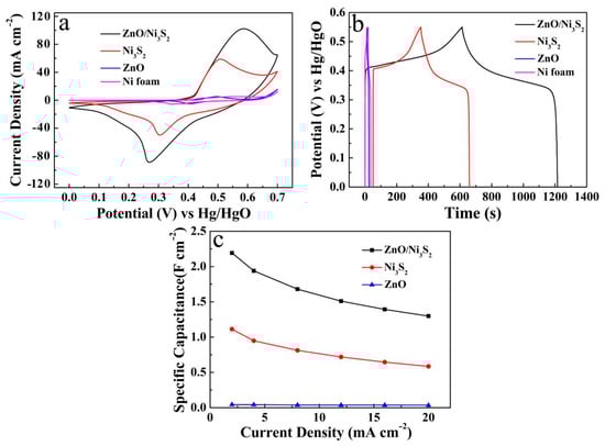 In order to study the electrochemical properties of the ZnO/Ni2S3 composite, CV and GCD measurements were carried out in a three-electrode system, in 2 M NaOH aqueous solution. As seen in Figure 6a, the CV curves for various electrodes are compared, at a scan rate of 20 mV s−1, including ZnO/Ni2S3, Ni2S3, ZnO, and Ni foam substrate. The ZnO/Ni2S3 composite has the largest enveloping area compared with the others, proving the maximum specific capacitance, while the ZnO and Ni foam have almost no capacitance characteristics. Further observation reveals that the CV curve of the ZnO/Ni2S3 composite contains a pair of strong redox peaks in the potential range of 0–0.7 V, which is ascribed to Ni2+/Ni3+ as the following electrochemical reaction [21,25]: