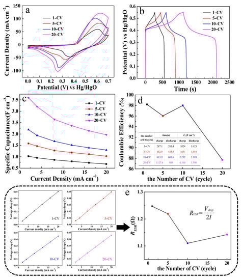 (a) CV curves, (b) GCD curves, (c) line diagrams of specific capacitance at different current densities, (d) coulombic efficiency and (e) voltage drops and RESR of the ZnO/Ni2S3 composite grown on Ni foam substrate with different CV electrodeposition cycles.