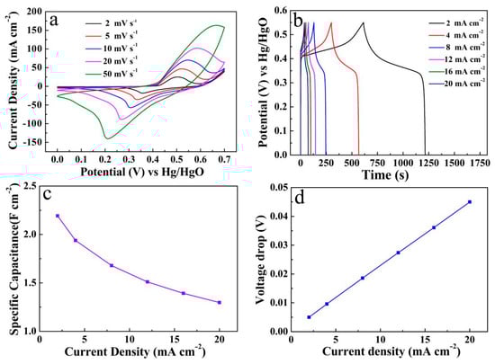 For the ZnO/Ni2S3 composite (10-CV), further CV measurements were performed, at different scan rates of 2–50 mV s−1 in the same potential window, as shown in Figure 10a. The redox peaks are symmetrical, and the variation trend of the CV curves at different scan rates is basically the same. In addition, with the increase in the scan rate, the area surrounded by the CV curves gradually increases, while the specific capacitance gradually decreases. This decrease is attributed to the fact that some active sites cannot fully participate in the redox reaction, due to the restriction of ion/electron diffusion at a larger scan rate [7]. Figure 10b reveals the GCD measurements at various current densities of 2–20 mA cm−2, in a potential range of 0–0.55 V. The GCD curves show an obvious pseudocapacitance characteristic because of their nonlinearity. The coulombic efficiency is as high as 98% at 2 mA cm−2, and detailed data have been recorded in Figure 9d. In addition, the specific capacitance of the ZnO/Ni2S3 electrode can be calculated by the formula in the Supporting Information [26].