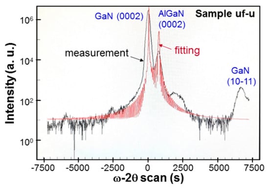 The results of ω-2θ scan in X-ray diffraction (XRD) measurement for sample uf-u. The black (red) curve shows the measurement data (fitting curve).