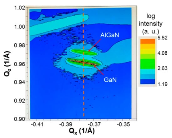 Reciprocal space mapping (RSM) result of sample uf-p. The vertical dashed line passing through the centers of the GaN and AlGaN features indicates that the AlGaN layer on the GaN template is fully strained.