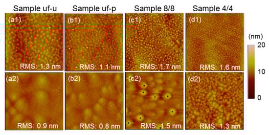 (a1–d1) (a2–d2) atomic force microscopy (AFM) images of samples uf-u, uf-p, 8/8, and 4/4, respectively, with (15 μm × 15 μm) (3 μm × 3 μm) in image dimension.