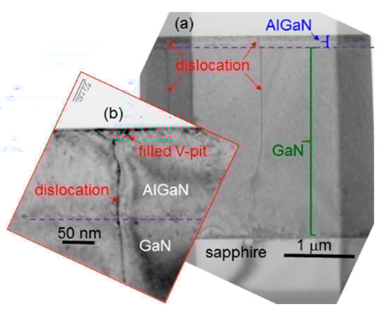 - Moon, Y.T.; Fu, Y.; Yun, F.; Dogan, S.; Mikkelson, M.; Johnstone, D.; Morkoç, H. A study of GaN regrowth on the micro-facetted GaN template formed by in-situ thermal etching. Phys. Status Solidi 2005, 202, 718–721. [Google Scholar] [CrossRef]