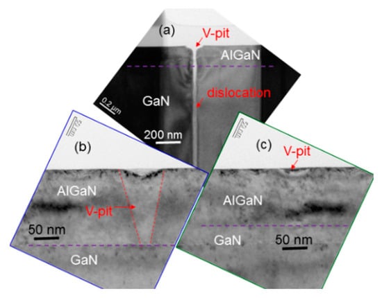 In Figure 5a, we show a cross-sectional transmission electron microscopy (TEM) image of sample uf-p, demonstrating the extension of two dislocations from the GaN template into the overgrown Mg-doped AlGaN layer. Here, the horizontal dashed line roughly divides the layers of AlGaN and GaN. In a few TEM images, we observe that dislocations in the Mg-doped AlGaN layer always originate from the GaN template. The TEM image in Figure 5b shows the structure of a dislocation around its top end. The V-shaped structure at the top end of the dislocation looks like a filled V-pit. This image may support the result of no V-pit observation in the AFM images of this sample shown in Figure 4(b1,b2). In this sample, most V-pits can be filled up to show hillock structures under the used metal-rich growth condition. Figure 6a shows a TEM image of sample 8/8 demonstrating an un-filled V-pit structure with a dislocation beneath. Then, in Figure 6b,c, we show the formation of a deep (shallow) V-pit in sample 8/8. The formation of the deep V-pit starts at the beginning of AlGaN growth. The shallow V-pit is formed near the top surface. However, no dislocation is observed beneath either deep or shallow V-pit. It is speculated that similar to a dislocation structure, the growth rate around a dislocation-free V-pit also becomes higher to consume the supplied constituent atoms of a fixed amount per surface area such that a hillock is formed around such a V-pit. Therefore, the growth of a layered structure can lead to the formation of a V-pit without a dislocation beneath. The formation of such a deep V-pit can be attributed to the lattice mismatch between the GaN template and the overgrown AlGaN. The formation of a shallow V-pit can be caused by the slight lattice variation between Mg-doped and un-doped layers. It is noted that we use the individually optimized growth conditions for depositing Mg-doped and un-doped layers. The different growth conditions lead to slightly different lattice structures between Mg-doped and un-doped layers. The accumulation of such small lattice variations can result in the formation of a shallow V-pit, as shown in Figure 6c. In this regard, a layered sample with a smaller layer thickness or a larger layer-period number can lead to a stronger accumulated lattice variation effect such that its V-pit density becomes higher. This speculation is roughly supported by the data in row 6 of Table 1, particularly those of samples 4/4, 6/6, and 8/8. However, the mechanism for such a behavior is still unclear and deserves a future study. The accumulated lattice variations between Mg-doped and un-doped layers can also increase the ω-scan FWHM in a layered sample. In this regard, a layered sample with a larger layer-period is expected to have a larger ω-scan FWHM, as confirmed by the data in rows 2 and 4 of Table 1. It is noted that we cannot differentiate an Mg-doped layer from an un-doped layer in the TEM images of Figure 6a–c because the difference between their lattice structures is small. Moreover, as the hillock height is only several nm, which is significantly smaller than its lateral dimension at several hundred nm, it is difficult to observe a hillock structure based on the TEM observation here.