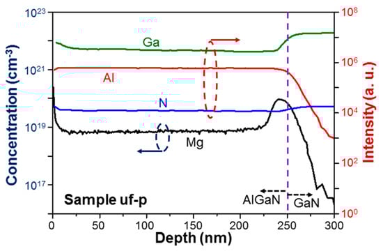 Secondary ion mass spectroscopy (SIMS) measurement results of sample uf-p with the left ordinate for the absolute Mg concentration and the right ordinate for the relative concentrations of Ga, Al, and N.