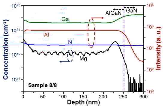 SIMS measurement results of sample 8/8 with the left ordinate for the absolute Mg concentration and the right ordinate for the relative concentrations of Ga, Al, and N.