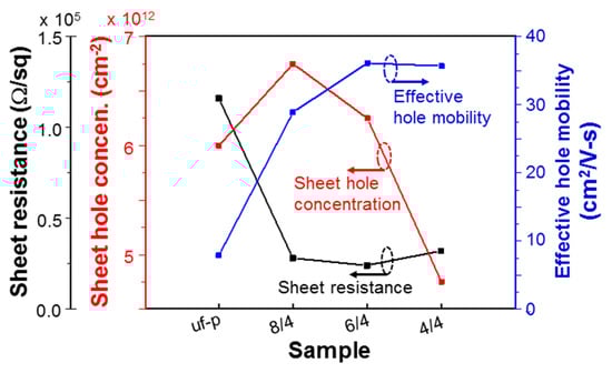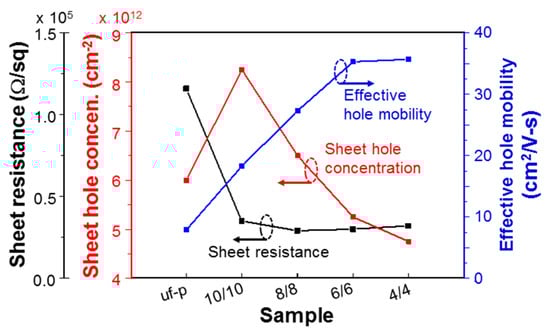 Variations of sheet resistance (with the first left ordinate), sheet hole concentration (with the second left ordinate), and effective hole mobility (with the right ordinate) of samples uf-p, 10/10, 8/8, 6/6, and 4/4.