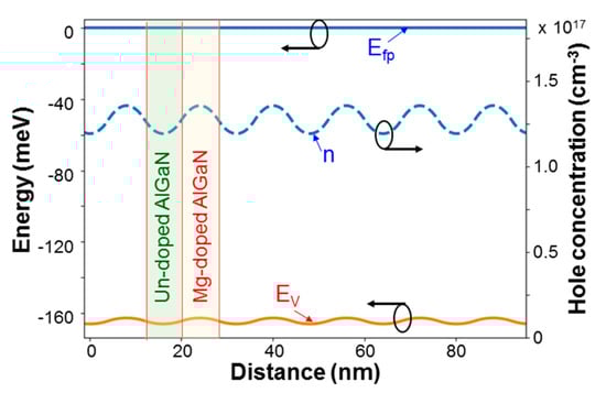 Figure 11 shows the simulation results of Efp, n, and EV in sample 8/8 by assuming that the Mg doping concentration in an Mg-doped layer is 2 × 1019 cm−3 and the acceptor activation energy in AlGaN of 25% in Al content is 240 meV []. Here, Efp represents the Fermi level energy of hole, n stands for the hole concentration, and EV denotes the valence band energy. The oscillating behavior of hole concentration in Figure 11 indicates the diffusion of holes from an Mg-doped layer into the neighboring un-doped layers. From the curve of EV, we can see that the valence band energy at the center of an Mg doped layer is lower than that at the center of an un-doped layer by 3.326 meV. This energy barrier is small such that holes generated in an Mg-doped layer can easily diffuse into the neighboring un-doped layers at room temperature.