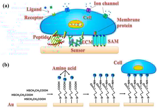 Different chemical modifications of a sensor surface for improving cell immobilization efficiency. (a) Schematic diagram of a cell coupled with a sensor surface by different surface modifications, including peptide, ECM, and SAM. (b) Schematic of the chemical process of cells immobilized on a gold surface via SAM [38]. Copyright © 2014, American Chemical Society.