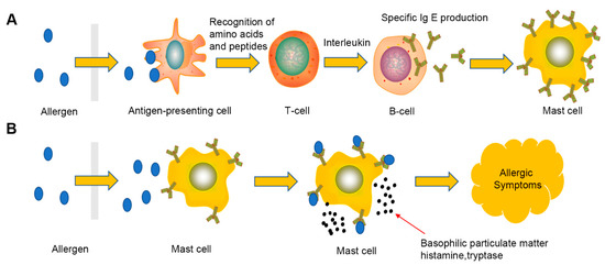 Food allergy mechanism. Food allergy results from an overblown reaction of the immune system to a food allergen. Two steps are necessary for this occurrence: an initial phase of sensitization to a specific antigen (A) and the elicitation of an allergic reaction after a second exposure to the same antigen (B).