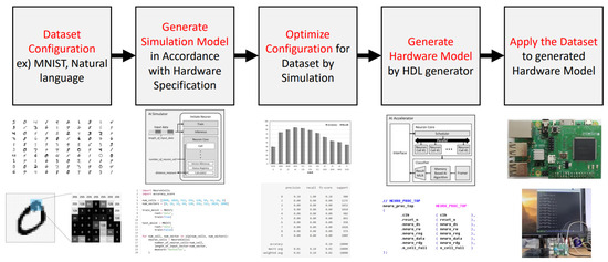 The overall sequence of the framework is as follows. First, the users decide what dataset they use for the embedded system. When the users decided the dataset, users also decide the specification of the embedded system, such as memory for the AI accelerator. The determined size of memory influences the generation of simulation models in the next step. Depending on the size of the memory, the user checks the results of the simulation, depending on the number of possible cells and the amount of memory a cell has. Based on the number of optimized cells and the memory size of the cells from the result of the simulator, users generate a hardware model using the HDL generator.