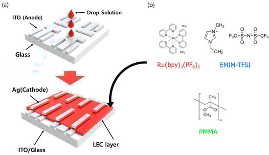 - Moon, H.C.; Lodge, T.P.; Frisbie, C.D. Solution-Processable Electrochemiluminescent Ion Gels for Flexible, Low-Voltage, Emissive Displays on Plastic. J. Am. Chem. Soc. 2014, 136, 3705–3712. [Google Scholar] [CrossRef]