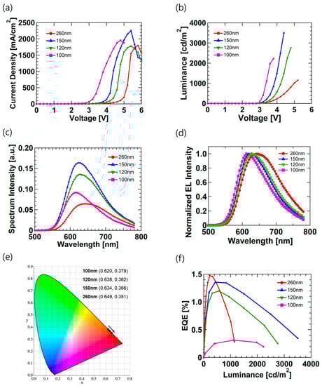 | Thickness Condition | J (mA/cm2) | Turn-on Voltage (V) | Luminance (cd/m2) | Maximum EQE (%) | RMS; Rq (nm) |