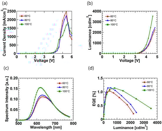 | Temperature Condition | J (mA/cm2) | Turn-on Voltage (V) | Luminance(cd/m2) | Maximum EQE (%) | RMS; Rq (nm) |