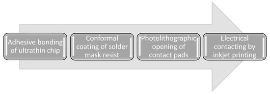 A process flow chart of the proposed fabrication process is shown in Figure 1. In the beginning, ultrathin chips were bonded face-up onto polyimide foil. Afterwards, the chip was covered in solder mask resist using conformal coating. Solder mask resist was locally removed in the area of the chip contact pads by photolithographic processes and cured. The chip contact pads were electrically connected and conductive tracks were formed by inkjet printing of silver and gold ink. Each element of the proposed process is explained in detail in the following subsection.