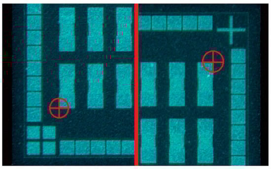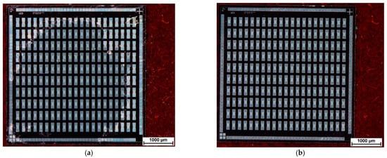 The coated substrates with embedded ultrathin chips were exposed to UV light using a direct light imager system (DI 2020L, MIVA Technologies, Schönaich, Germany) to open the metallic surface of the chip contact pads. The imaging system did not require a physical mask for the UV exposure process. A machine head with built-in UV-LEDs was moved above the vacuum-fixed substrate. Four different wavelengths, namely 365 nm, 375 nm, 385 nm and 405 nm, could be used simultaneously as well as individually for the exposure process. For the exposure of the solder mask resist, all wavelengths were used in equal dose proportions. The exposure dose was adjusted by movement velocity of the head as well as the LED current for each wavelength. For the exposure of the coated substrates, the head movement velocity and the LED currents were set to parameters that equaled an exposure dose of 1130 mJ/cm2. Two layouts for the exposure were designed with different via sizes and geometries using conventional PCB layout software. Each layout was divided into circular contact pad openings in the chips upper half and rectangular contact pad openings in the chips lower half. One layout generated circular via openings of 90 µm diameter and rectangular via openings of 90 µm × 90 µm. The other layout generates circular via openings of 130 µm diameter and rectangular via openings of 130 µm × 130 µm. The size of 90 µm was chosen to stay above the stated technical resolvable limit of 80 µm for photolithographic opening size as stated by the manufacturer of the solder mask resist []. The size of 130 µm was chosen arbitrarily to test ink behavior during and after printing with larger via openings. Areas for exposure as well as virtual markers in two opposite chip corners (Figure 2) are defined within the layouts. The markers served as fiducial points for optical recognition before each UV exposure to ensure alignment. The exposed negative-tone resist was allowed to cross-link for five minutes after UV exposure. The development process was executed for a duration of 30 s in a spray developer using aqueous potassium carbonate solution at 30 °C. The substrate was cleaned afterwards using deionized water. The photolithographic process was completed by thermal curing in an oven at 150 °C for 60 min. The summarized exposure, development and thermal curing parameters are listed in Table 2.