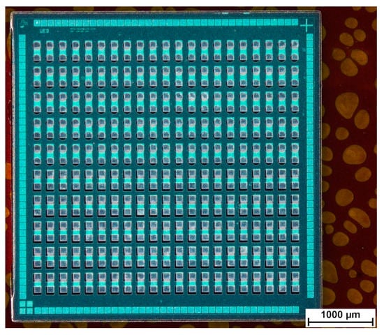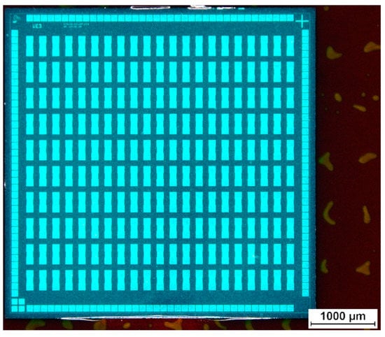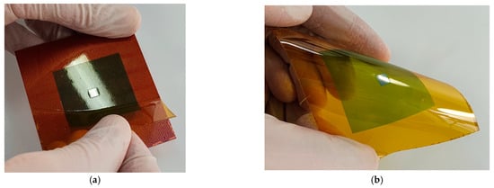 The wafer dicing tape can be removed easily without damages to the silicon chips. Remaining adhesive from the wafer dicing tape on the surface of the epoxy bonded chips was mechanically cleaned using acetone and clean room tissues. A chip on polyimide foil after acetone cleaning is displayed in Figure 4. Further details about the ultrathin chip bonding process using a wafer dicing tape as a temporary chip carrier can be found in [,]. After cleaning, a layer of solder mask resist was spray coated onto the ultrathin chip. Figure 5 shows the surface of an ultrathin chip embedded in spray coated solder mask resist.