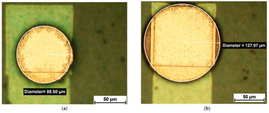 Circular via openings with (a) a diameter of 90 µm and (b) a diameter of 130 µm.