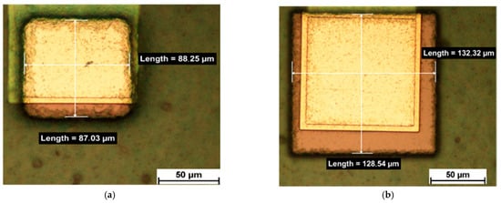 The different via openings after photolithography are shown in Figure 6 and Figure 7. Figure 6 shows circular via openings of 90 µm diameter and 130 µm diameter, respectively. Figure 7 shows rectangular via openings of 90 µm × 90 µm and 130 µm × 130 µm, respectively. Figure 8 shows an overview of an embedded chip with circular via openings in the upper half and rectangular via openings in the lower half with 130 µm feature sizes.
