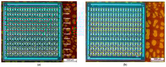 Inkjet printing of commercial nanoparticular inks was utilized for electrical contacting of the chip contact pads. A silver ink (Sicrys I30EG-1, PV Nano Cell, Migdal Ha’Emek, Israel) as well as a gold ink (DryCure Au-J, C-INK, Soja City, Japan) were printed using a lab inkjet printer (Dimatix DMP 2850, FUJIFILM Dimatix, Santa Clara, CA, USA) for via filling and track formation. An amount of 2 mL of ink was filled into cartridges (DMC 11610, Fujifilm, Japan). A filter with 450 nm pore size was used for the silver ink to filter out agglomerates. The gold ink was filled into the cartridge without filtering. A 10 pL print head module with 16 nozzles was mounted onto each cartridge and the cartridges were installed into the printer. A layout for printing was designed using a conventional PCB layout software. The layout was exported in a monochrome bitmap file with 1016 dpi resolution. This resolution equals a drop spacing of 25 µm at a cartridge angle of 5.6°. The surface of the substrate was cleaned with acetone and a cleanroom tissue. For the printing process of both inks, the print head was heated to 35 °C and the temperature of the substrate table was set to 50 °C. Only one nozzle of 16 potential nozzles was used to perform the print to allow for fast visible control if the printing nozzle clogs or the ejected droplets are not shot perpendicular to the surface. The same layout for track printing and via filling was used for the rectangular and the circular via openings. The number of layers was varied between the daisy chain structure lines. In total, ten daisy chain lines were available for printing. The first daisy chain line and the sixth daisy chain line were printed as a single ink layer to check for correct alignment. For later electrical measurements the other daisy chain lines were printed as a single ink layer, two ink layers, three ink layers and five ink layers. This was set as printing strategy for the circular as well as for the rectangular via openings. An overview over the printed layer count is displayed in Figure 3. After the printing process, the solvent was mostly evaporated due to the heated substrate table. The printed nanoparticles were sintered in an oven for 60 min at 150°. The electrical characterization was performed by needle probing in a two-probe electrical measurement (Multimeter 2002, Keithley Instruments, Cleveland, OH, USA) to determine the transition resistance. Additionally, white light interferometry (Wyko NT 9100, Bruker, Billerica, MA, USA) was performed to determine the thickness distribution of printed tracks. Finally, the foil with the embedded chip was removed from the temporary carrier.