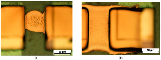 For the UV exposure of the photosensitive solder mask resist, a dose of 1130 mJ/cm2 was found to be sufficient to start the cross-linking reactions in the material. The most influential factor on the resulting resist mask was the development duration. On the one hand, the duration of the development process must be chosen long enough to remove all insulating solder mask material on the chip contact pads. On the other hand, the edge formation of the solder mask was deteriorated if the sprayed developer reacted for too long with the solder mask. Instead of the recommended 60 s, the development duration was reduced to 30 s. All contact pad openings were successfully opened after development. This demonstrated that thinning with PGMEA is possible. In comparison with conventional mask photolithography, the utilization of direct light imaging offers a significantly faster development process of new prototypes. The layout can be altered digitally in a short time without an additional costly fabrication of a new set of masks.