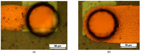 The measurements of transition resistances listed in Table 3 and Table 4 show mixed results. It should be noted that inhomogeneous track thicknesses affected the measured resistance values during needle probing. A placement of the needles in the peripheral region of the printed track showed different resistance values than a measurement in the center of the printed tracks dependent on the printed ink. For silver ink, a smaller opening dimensions showed lower resistance values and no defects in comparison to larger via openings with multiple defects. Gold ink did not show this distinct difference. This may result from a combination of different wetting behaviors of the inks and residual solder mask resist after development in the 90 µm via openings that served as a ramp for the inks. The silver ink Sicrys I30EG-1 was based on ethylene glycol as the solvent. The gold nanoparticles of DryCure Au-J were dispersed in a water–glycerol mixture. The lower surface tension of ethylene glycol may have caused a disconnection between the ink on the top of the solder mask resist and the ink in the via opening. The largest proportion of the ink flowed downwards into the via opening without adhesion to the wall of the via opening. As a result, the wall coverage was insufficient, resulting in defects and high resistances. A ramp of residual solder mask can bridge the difference in height and aid the formation of a conductive track. A higher number of layers cannot completely compensate the poor wall coverage, but increases the risk of merging of excessive ink. The higher surface tension of the water–glycerol mixture may prevent disconnection between the ink on top of the solder mask and ink in the via opening. The influence of surface tension and wettability of solder mask on wall coverage will be investigated in future work.