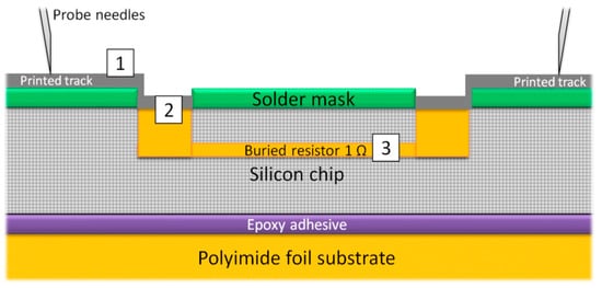 Schematic layer structure (not to scale) of an epoxy bonded chip on polyimide substrate and embedded in solder mask. The chip exhibits buried resistors (1 Ω). The contacts pads of the buried resistors were opened and contacted by inkjet printing. Mainly three factors influence the transition resistance from the first probe needle to the other probe needle. (1) Resistance of the printed track; (2) contact resistance at the interface; (3) the resistance of the buried resistor.