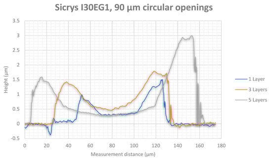 White light interferometry measurement of the silver track thickness between circular via openings with 90 µm diameter after 1, 3 and 5 printed layers.