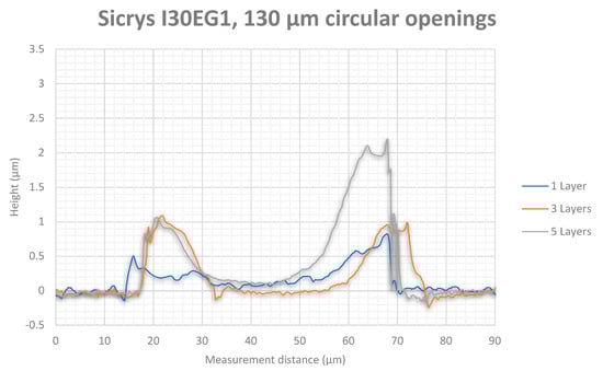 White light interferometry measurement of the silver track thickness between circular via openings with 130 µm diameter after 1, 3 and 5 printed layers.