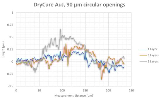 White light interferometry measurement of the gold track thickness between circular via openings with 90 µm diameter after 1, 3 and 5 printed layers.
