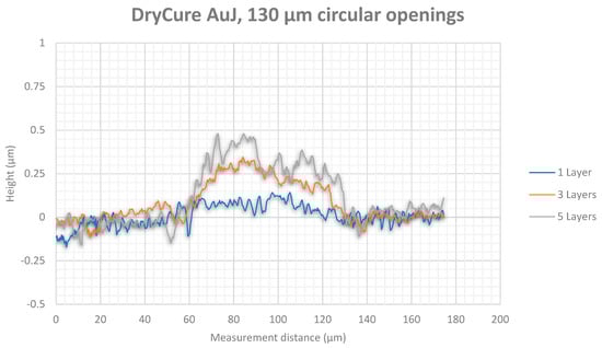 White light interferometry measurement of the gold track thickness between circular via openings with 130 µm diameter after 1, 3 and 5 printed layers.