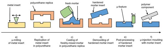 Concrete and mortar are wildly used as materials for construction purposes worldwide []. Although this technology has been extensively investigated for decades, no published scientific work exists on the application of concrete or mortar for the fabrication of tools for injection moulding purposes, according to the best of the authors’ knowledge. This paper describes how mortar can be applied as a tool material in a soft tooling process chain for micro injection moulding. The experimental work was focused on documenting the ability of mortar to replicate micro features of a master geometry. It was also demonstrated how a soft master geometry, for example made by additive manufacturing, can form the starting point of the soft tooling process chain.