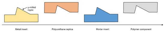 The mirroring of the geometry throughout these process steps is explained based on a single micro-milled structure (ripple) of the QR code (Figure 3): QR code in steel (negative)—PU replica (positive)—mortar (negative)—polymer (positive). Due to the characteristics of the QR code/ripple geometry, the mirroring effect is not critical. However, should other geometries be considered for this soft tooling process chain, attention must be made to ensure that the desired geometry is achieved with the injection moulding process step.