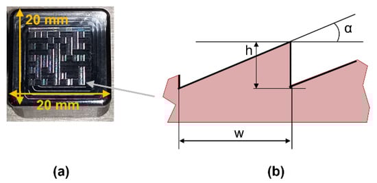 (a) Metal insert with 10 × 10 pixels on its surface; (b) Schematic profile of a micro-milled ripple with tilting angle α, ripple height h and ripple width w.