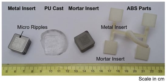 There was no observation of cracking of the mortar insert during the injection moulding experiment. ABS did not stick to the surface of the mortar insert, and the demoulding of ABS did not cause any problems. All three replication steps (metal insert to polyurethane cast to mortar insert to ABS component) combined did not lead to any significant surface defects with respect to the measurand under observation and the methods used.