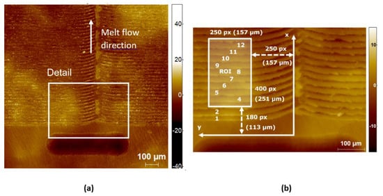 Figure 7 shows the corrected height map of the area in focus as obtained with the confocal microscope. The identification of the analysed ridges is indicated in Figure 7b. The exact position of the region of interest is indicated by the coordinate system. With this identification, it is possible to find the same region of interest on all physical parts of the soft tooling process chain. On specimens with negative geometry (metal insert, mortar insert), the y-axis points to the left-hand side, whereas it points to the right-hand side on specimens with positive geometry (PU replica, ABS parts). This is due to the mirror effect, which comes along with each replication step.