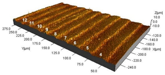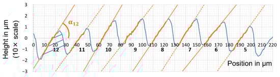 Figure 8 shows the selected region of interest from Figure 7. The ridges are clearly identifiable, and a certain degree of homogeneity is visible. It can be observed that there is a certain height variation of the ripples, and therefore, it was decided to calculate the tilting angle α of ripples 5 to 12, respectively (Figure 9).