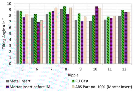 The evaluation of the corresponding ripple angles had been performed for every element under investigation: The steel insert, the PU cast, the mortar insert, and the resulting ABS part. Figure 10 shows the comparison of tilting angle of ripples 5 to 12 for each element, respectively. It can be observed that the angle of one specific ridge typically is within 1–1.5° between the four process steps. Ripple 10 is an exception to this. The PU cast generally seems to have steeper angles than the metal insert. Tilting angle seems to decrease from PU cast to the mortar insert, with the exception of ripples 7 and 10. From independent analysis of the functionality of the QR codes, we have seen that any variations of ridge angle above 5° will influence the functionality [].