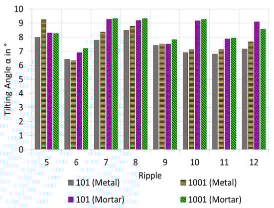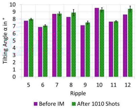 If wear occurs, it would be natural to expect a decrease in the tilting angle. Therefore, the tilting angle of the ripples on the mortar insert before injection moulding and after 1010 shots was considered (Figure 12).