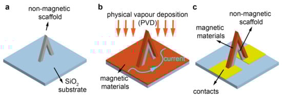 Creating a 3D nanomagnetic circuit using the combination of a scaffold and PVD. (a) Create a non-magnetic scaffold. (b) Incorporate magnetic materials using PVD, magnetic thin films deposited will shunt current from the 3D structure. (c) The ideal 3D nanomagnetic circuit created using ‘scaffold + PVD’ method.