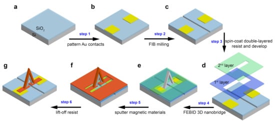 Fabrication process. (a) Prepare a clean silicon substrate with 300 nm thermally oxidised silicon dioxide. (b) Pattern Au contacts using optical-lithography and sputtering. (c) Mill a trench between two contacts using focused ion beam. (d) Spin-coat and pattern the double-layered resist. (e) FEBID 3D Pt-C scaffold (f) Sputter multilayered materials. (g) Lift-off resist.