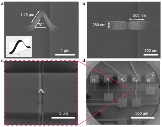 Within the window opened, a non-magnetic 3D bridge is deposited across the trench (Figure 2e) via FEBID combined with a recent CAD-implementation, which allows the deposition of complex nanostructures directly from standard 3D computer aided design (CAD) files [18]. A 3D Pt-C bridge (CAD design shown in Figure 3a) is deposited using a non-magnetic precursor (CH)Pt(CCH) with an accelerating voltage and beam current of 30 kV and 21 pA, respectively. A layer of Ta/Pt (2/10 nm) is sputtered on top of the sample prior to the FEBID deposition to alleviate charging effects during the deposition. The front and top view of the fabricated bridge scaffold (Figure 3a,b) show that the legs of the fabricated bridge are 1.45 m long, 280 nm wide, forming an angle of 70 with the substrate. From the top view, we observe a reduced width and thickness with respect to the CAD file at the middle part of the bridge where the two legs connect. This is due to the very shallow angle of that central part, which leads to a reduction in the number of secondary electrons generated and hence slows down the growth speed [34]. Further optimization would be required for a better match with the design. However, this structure works well for the purpose of this paper, focused on the demonstration of the integration of multilayered material on a 3D nanostructure.